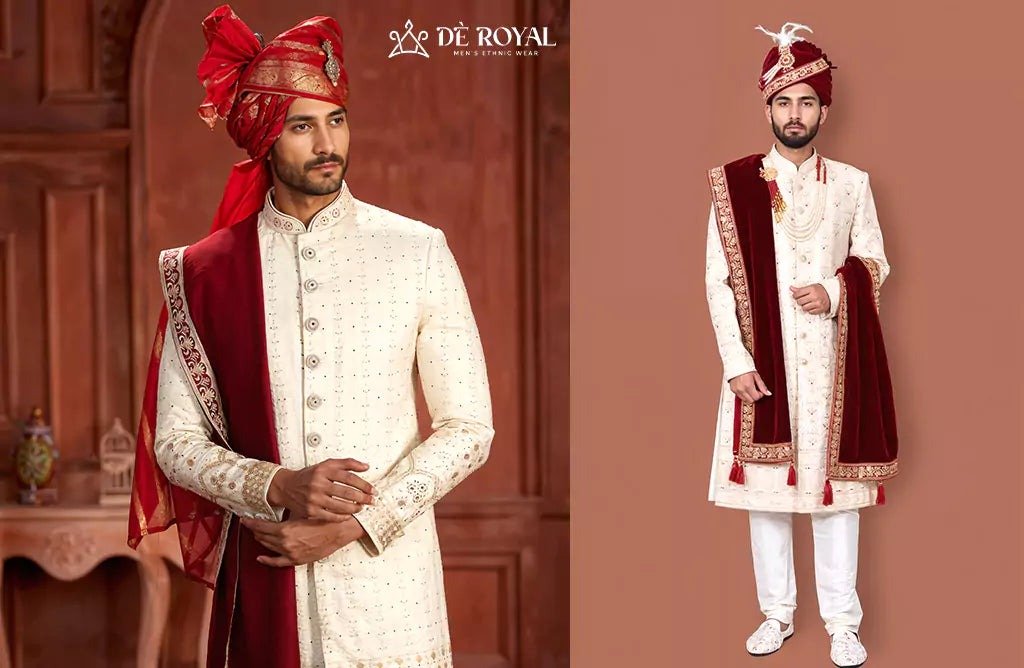 While minimalism is trending, heavy embroidered sherwanis still hold their royal charm. Intricate zari, zardozi, and Mughal motifs create a rich, traditional look. Ideal for grand weddings where you want a strong regal presence.