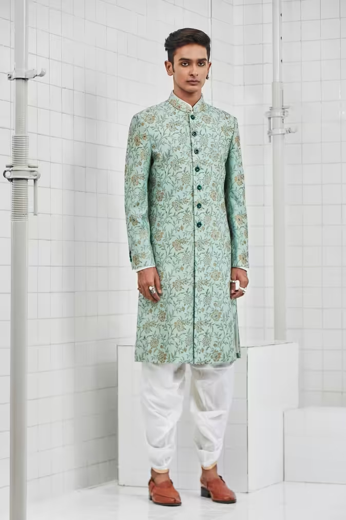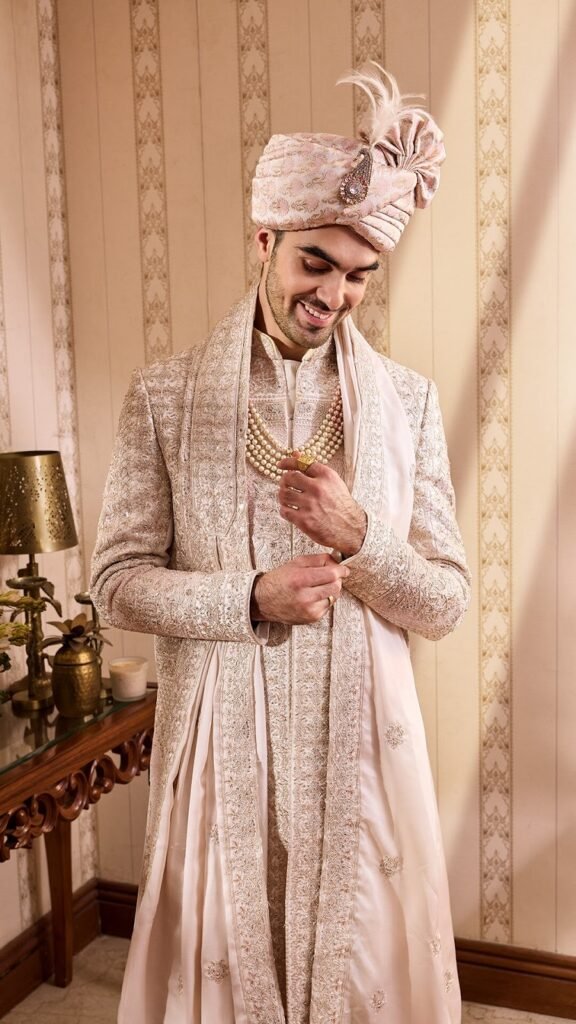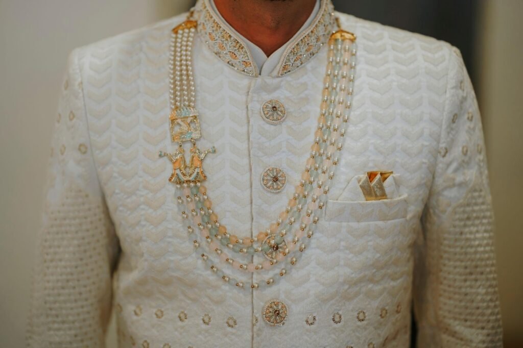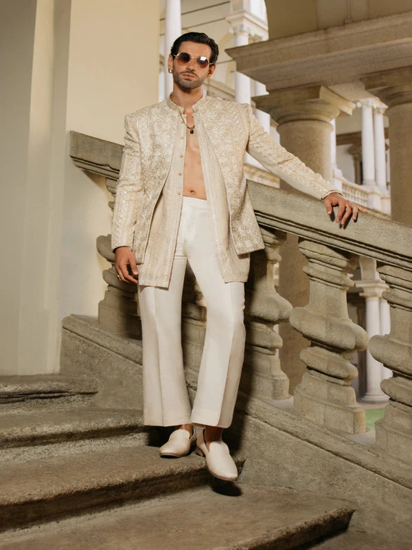 Instead of heavy embellishments, designers are focusing on texture, like raised threadwork, quilting, and tone-on-tone embroidery. These details add depth without looking overdone. It’s perfect for grooms who want understated luxury.
