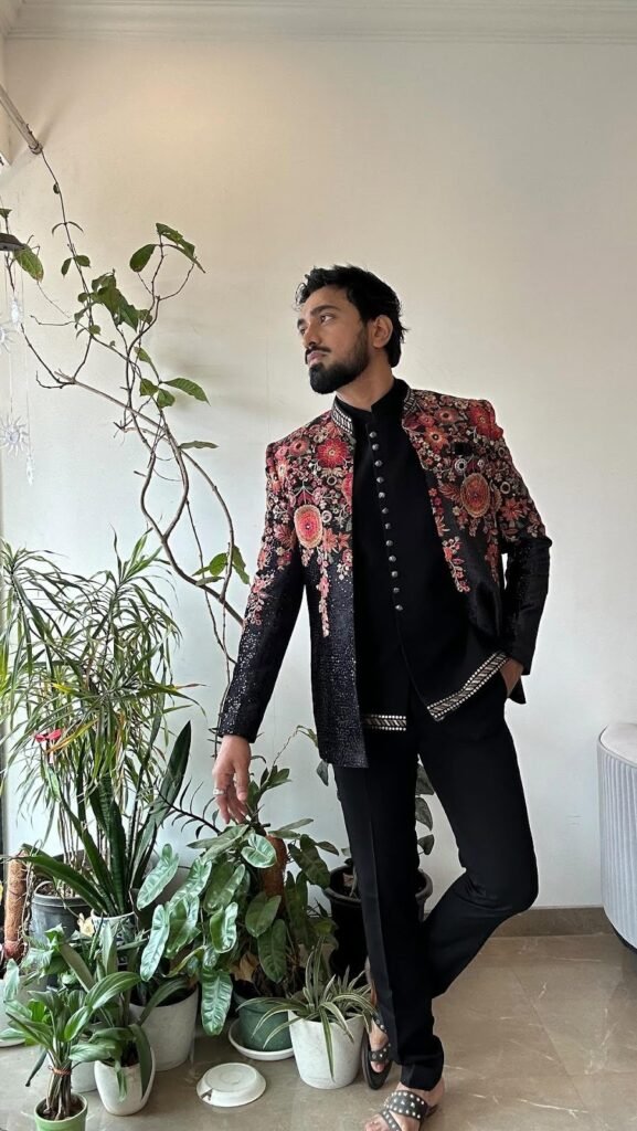 The bandhgala is making a strong comeback with modern tailoring and global influence. It’s structured, sharp, and perfect for receptions. This outfit gives a royal yet international vibe.