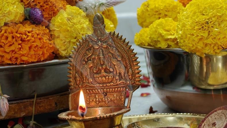 Decorative pots filled with flowers or turmeric add both aesthetic and functional value. They enhance the setup and also tie into the ritual. These small details make the décor look complete and thoughtfully designed.