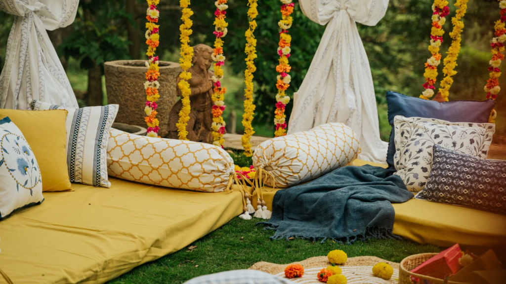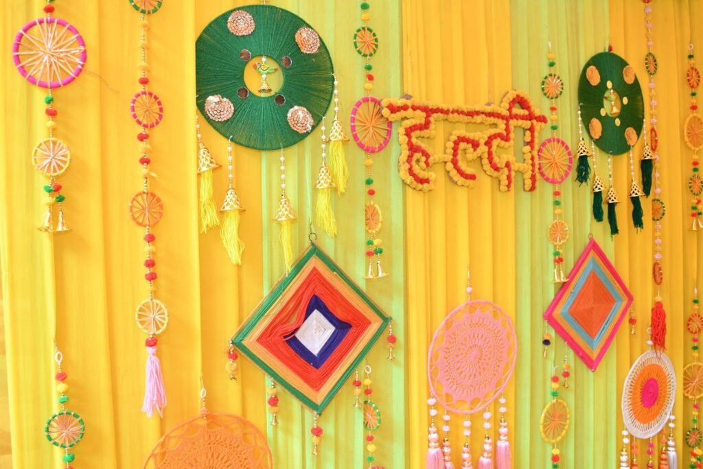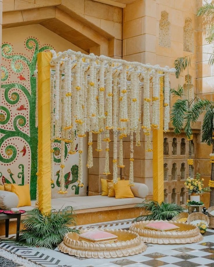 Tassels and fabric hangings add texture and movement to the décor. They create a playful and lively setting that looks great in candid shots. This style works well for modern Haldi themes.