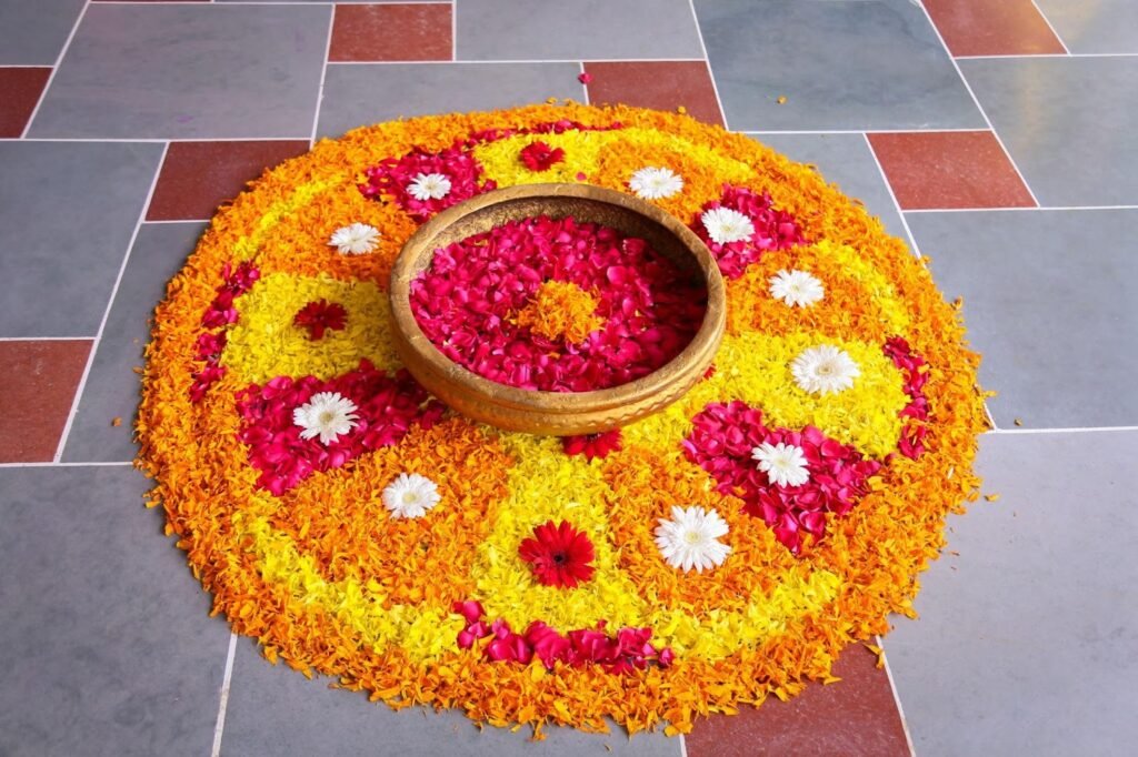A floral rangoli made with petals adds traditional beauty to the decor. It enhances the ground space and looks stunning in overhead shots. You can use patterns, initials, or creative designs to make it more personalized.