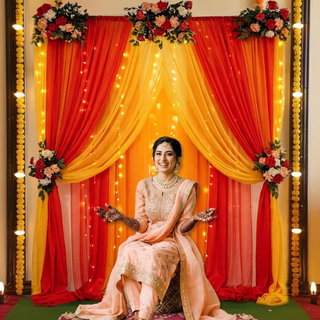Layered drapes in vibrant colors like yellow, orange, and pink create a lively and festive atmosphere. The movement of fabric adds softness and flow to photographs. This style is ideal for creating a rich and colorful Haldi setup.