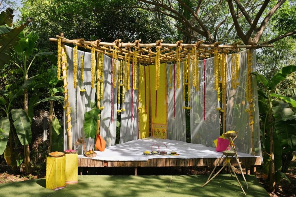 Banana leaves add a tropical and traditional charm to Haldi decor. When combined with yellow flowers, they create a fresh and vibrant contrast. This style is especially popular in South Indian weddings and outdoor setups. It also adds a natural, eco-friendly touch to the decor.
