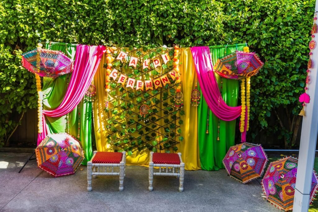 Colorful umbrellas add a fun and quirky vibe to the Haldi ceremony. They can be hung overhead or placed around the venue for a playful look. This setup works especially well for daytime ceremonies and creates lively, vibrant photographs.