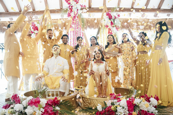 The combination of yellow and pink creates a bright, youthful, and energetic vibe. It adds contrast while still maintaining the festive Haldi theme. This color palette looks vibrant in photos and videos.