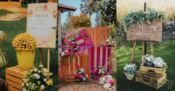Wooden elements such as crates, stools, and frames create a rustic and earthy vibe. When paired with yellow flowers, it balances tradition with modern aesthetics. This style works beautifully for outdoor weddings and gives a warm, natural feel.