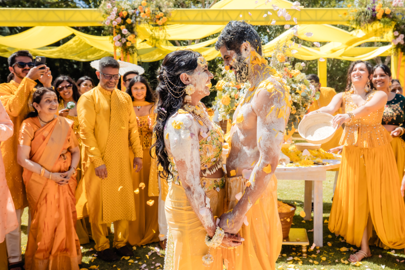 A beachside Haldi ceremony offers a relaxed and scenic environment. Minimal décor with yellow accents complements the natural beauty of the ocean. The setting looks effortlessly stunning in photographs.